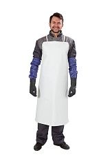 Длинный фартук предохраняет от загрязнений, жиров, кислотных или щелочных растворов. Эта модель универсального размера и удобна в носке благодаря широким наплечникам и тесьме.
